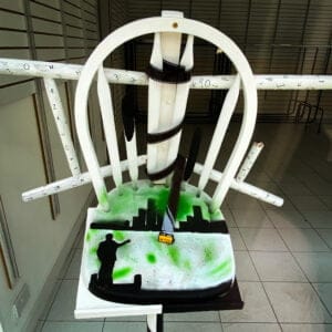 Our chair has been painted black to represent the slower and darker days of Covid-19 and the death of free movement, specifically live music events, cinema and theatre.