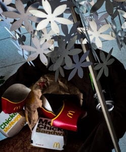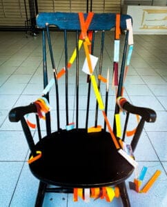 The bright paper strips are stapled and entwined around the black bars of the chair to reflect the glimmer of optimism of the lifting of lockdown restrictions allowing us to be young and free to rock again.