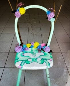 The skeleton we painted on the chair represents the lives that have been lost due to the virus, to show the new life that death brings we made fabric flowers and added them onto the skeleton.