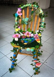 We focused on the words abandoned, overgrown and possibly derelict, but added a magical fantasy element. Using the chair as if were a stage set we have entwined it with overgrown ivy, bright flowers using a mix of media.