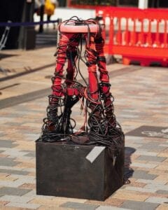 Davis has repurposed the functional aspect of a theatre experience (the chair which is sat on) to sculpturally portray the domineering and controlling qualities of Covid-19. The “emergence” growing from the chair suggests how the virus continues to dictate over and force communities out of the spaces that they may have previously taken for granted.