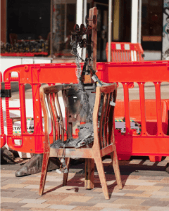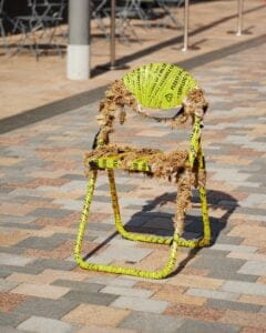 This chair represents the peak of social distancing, it highlights the importance of the 2m ruling to keep everyone safe. Covered in moss, this chair also demonstrates the how galleries, museums and theatres have been left behind other business during the pandemic.